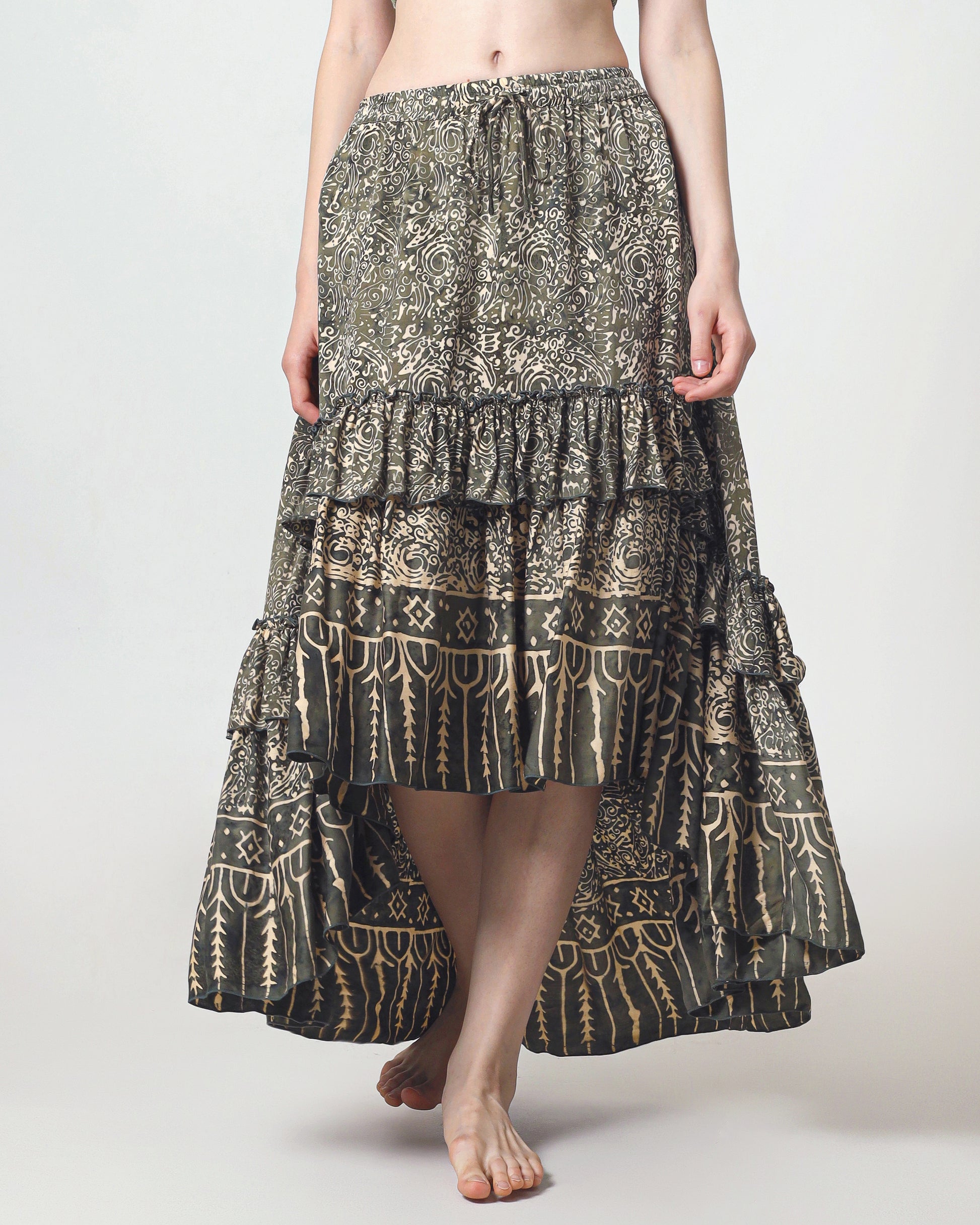 This skirt features a shorter front and a longer back design, complemented by an elastic waistband for a comfortable fit. Made from soft fabric, it ensures both style and comfort throughout the day.