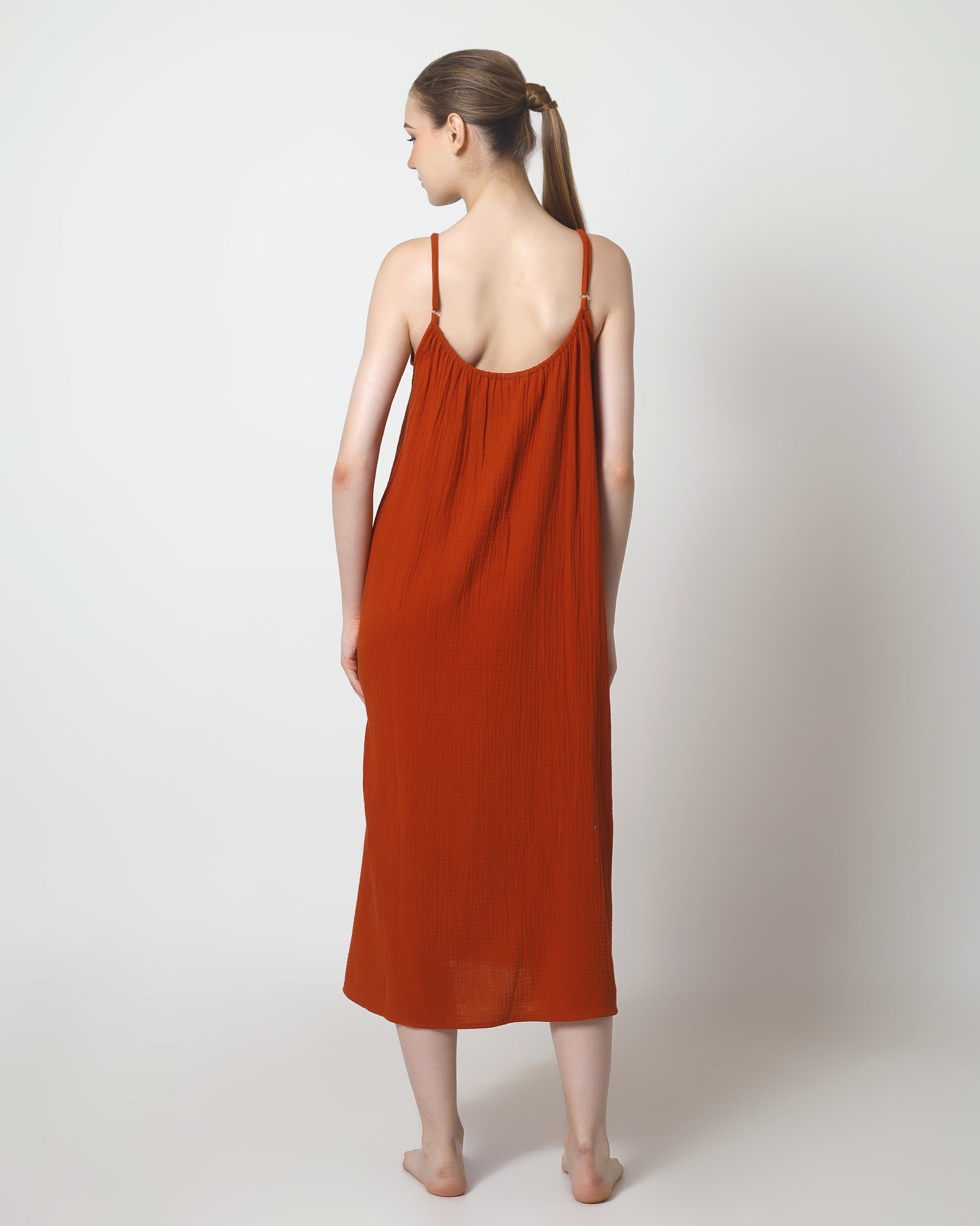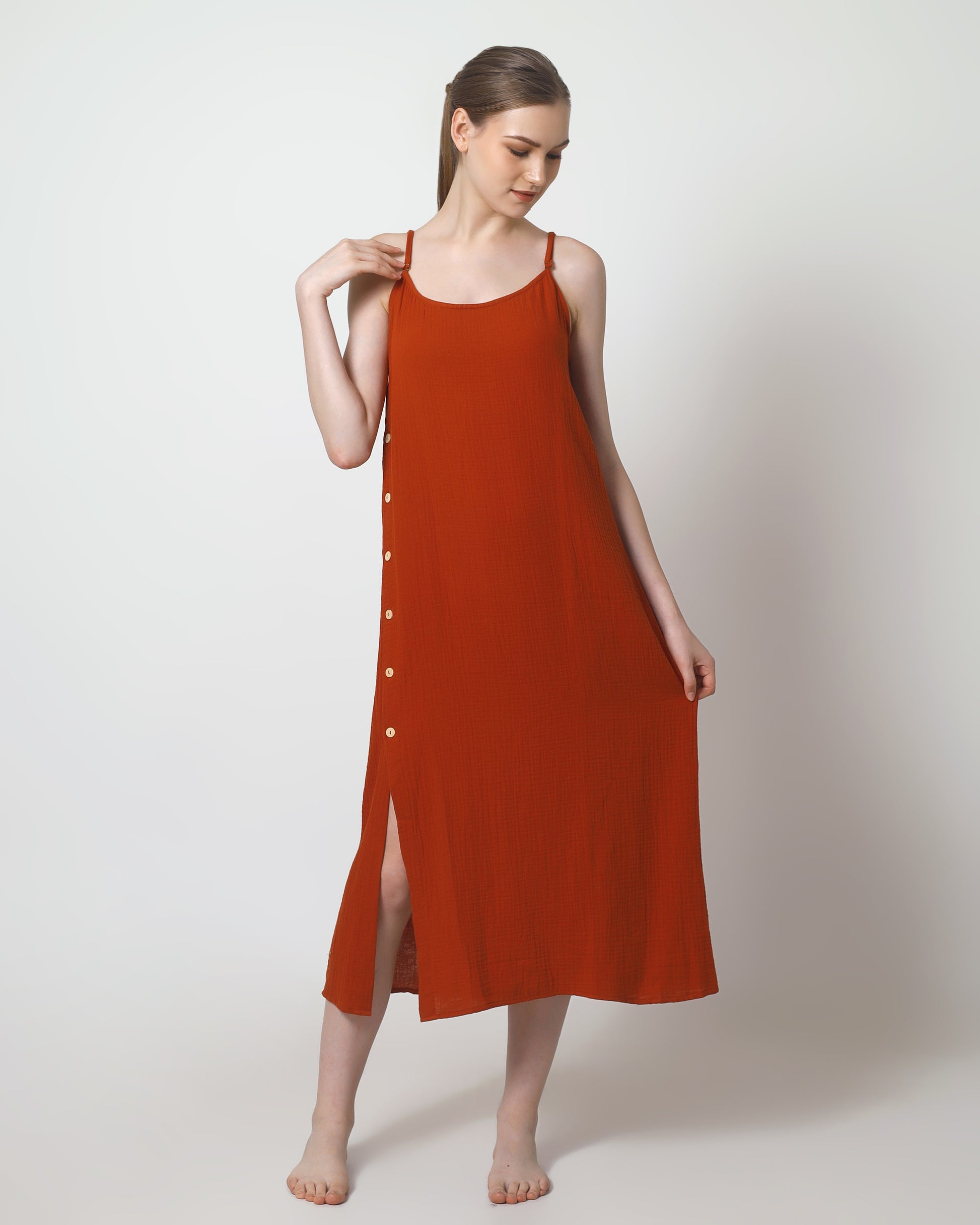 The Río is a long dress featuring button embellishments on one side, adding a subtle sweetness to your look. Its side slit is modest in height, ensuring both comfort and an elegant silhouette. This design expertly balances style and practicality, making it suitable for both formal and casual occasions.