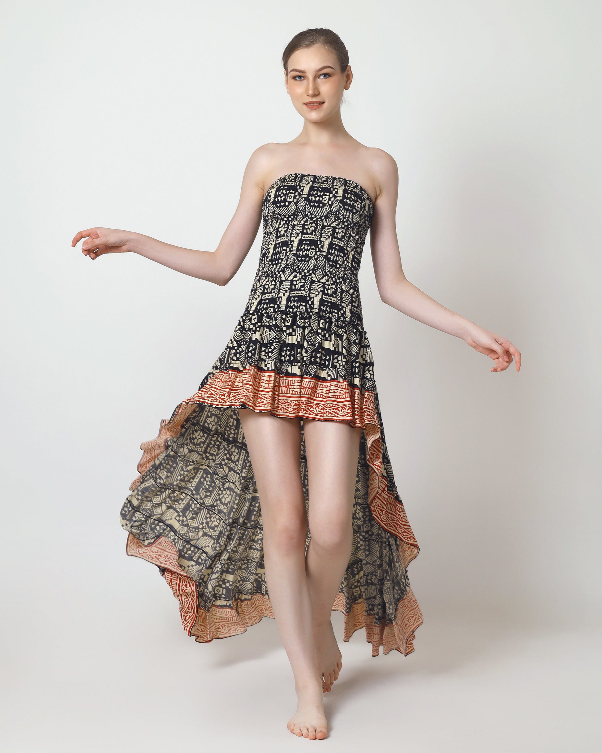This Valle dress features an elasticized chest area for a comfortable, flexible fit. Its distinctive design showcases a shorter front hem with a longer back, creating a dynamic and elegant silhouette that enhances movement and style while maintaining ease of wear.
